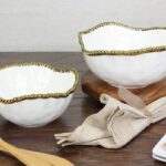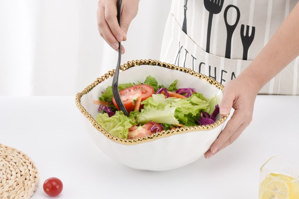 Large salad bowl in Salerno. Perfect as a large centerpiece or for dinner parties. Serve up an assortment of fruits, pasta or salad with ease. Use it as a family size serving bowl for popcorn. Gleaming white porcelain with lustrous silver beads in titanium. Food safe. Dishwasher safe. Oven safe to 350°. Easy Care.