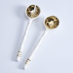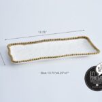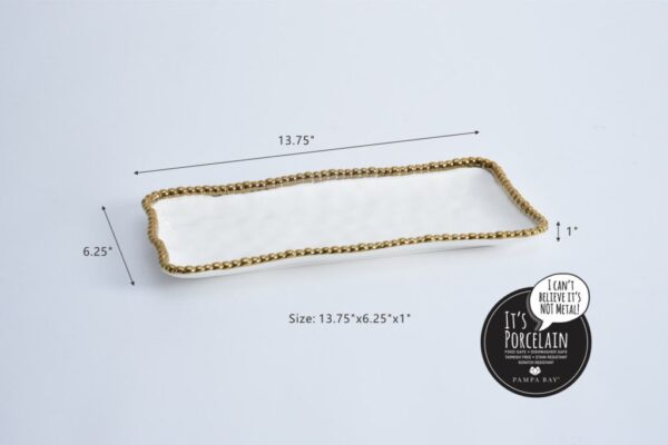 Medium Rectangular Tray in Golden Salerno. Perfect for serving bite-size appetizers and desserts like mini-cupcakes, cookies and deviled eggs. Or pair with a small bowl for a wonderful crudités and dip. High-fired white porcelain with lustrous gold beads in titanium. Food safe. Dishwasher safe. Oven safe to 350°. Easy Care.