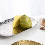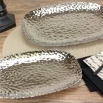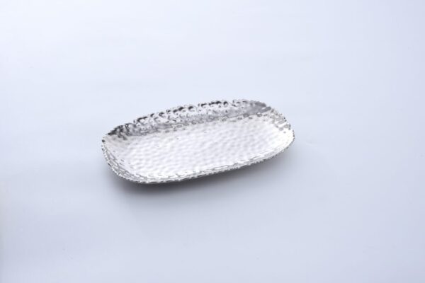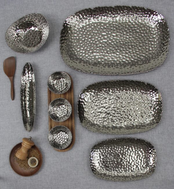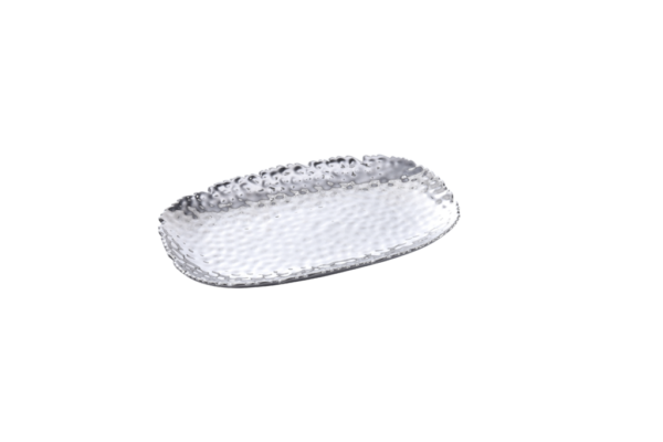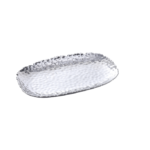 Small sized serving platter in Millennium. The hammered texture and organic edges of this beautiful platter enable it to blend with a variety of table setting motifs. Perfect for appetizers, sliced baguettes or desserts. Striking and elegant silver tone titanium finished high-fired porcelain.