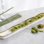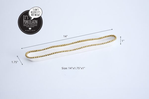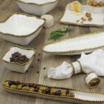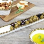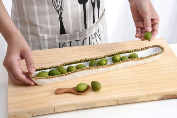 Olive Serving Dish in Golden Salerno. Ideal for serving marinated olives, but also interesting way to display small candies, berries…any small edibles. We like it filled with rich Belgian chocolate truffles! High-fired white porcelain with lustrous gold beads in titanium. Food safe. Dishwasher safe. Oven safe to 350°. Easy Care.