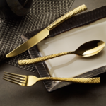 Dine in pure elegance with luxurious gold titanium-plated Paris Hammered flatware. The exquisitely hammered texture reflects the light to create a dramatic statement to your table setting. The set is made of stainless steel and includes 4 dinner forks, 4 dinner spoons, 4 dinner knives, 4 salad forks and 4 teaspoons. Highest quality 18/0 stainless steel. Dishwasher safe 25-Year warranty
