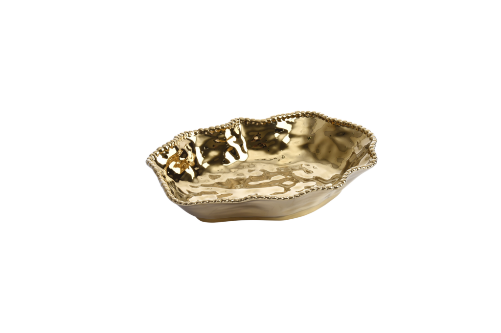 Large shallow oval serving bowl in Monaco. Whether you are serving stuffed shells, roasted chicken breasts or grilled vegetables, your food will look more elegant in this Monaco serving bowl. Striking and elegant gold-tone titanium finished high-fired porcelain.