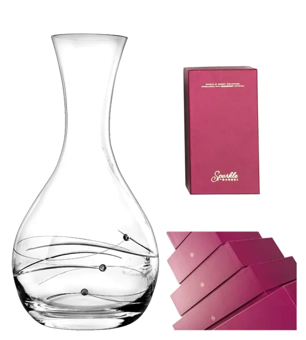 Finest european quality Glass for ultimate sparkle and clarity 41 oz. carafe – 10.25 “Height – 5” Diameter Top Rack Dishwasher Safe Make a great gift for someone who appreciates quality and the finer things in life. Laden with true Swarovski gems Exquisitely gift boxed, no need to wrap.